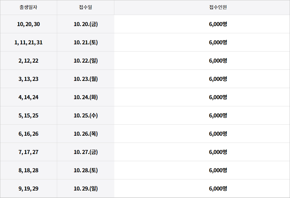 2023.10.20(금) ~ 2023.10.29(일) 중 출생일자별 해당일