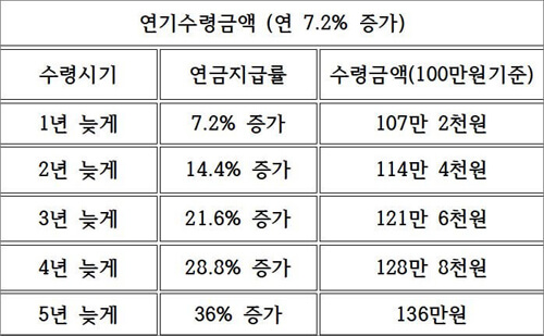 최대 5년까지 지연시킬 수 있는 국민연금은 1년마다 연 지급율을 7.2%(월 +0.6%)씩 올려줍니다. 만약 5년을 늦춘다면 자그마치 36%가 증가된 연금을 받을 수 있는 것입니다. 국민연금 첫 수령시기인 60세에 직업을 가지고 있거나 수입이 있다면 연금을 연기하는 것이 좋습니다.
