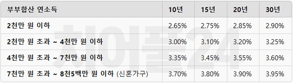- 전년도 소득 기준 부부합산 6천만 원 이하(생애 최초 구매자나 미성년 자녀가 2명 이상인 경우 7천만 원, 신혼부부 및 특정 조건 해당자는 최대 8천5백만 원 이하)