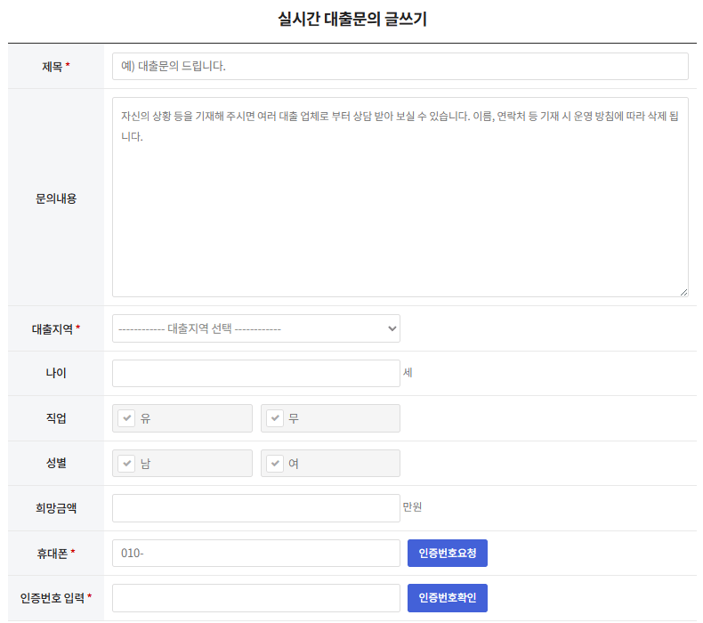 🔹실시간 대출문의: 본인의 상황과 희망조건을 입력하면, 업체가 역제안을 보내는 방식입니다. 상담 효율이 높고 대출까지 걸리는 시간이 짧아 초보자에게 특히 유용합니다.