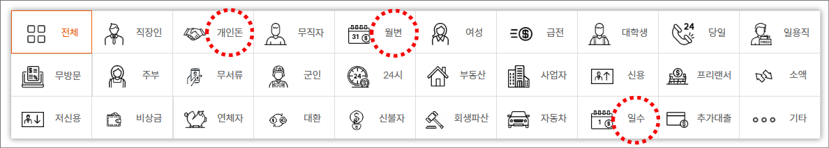대출24는 ①지역별 ②상품별 ③실시간 대출문의, 총 3가지로 구분되어 있습니다. 타사와 달리 월변, 일수, 개인돈으로도 상품 검색이 가능해 유용하게 쓸 수 있습니다.