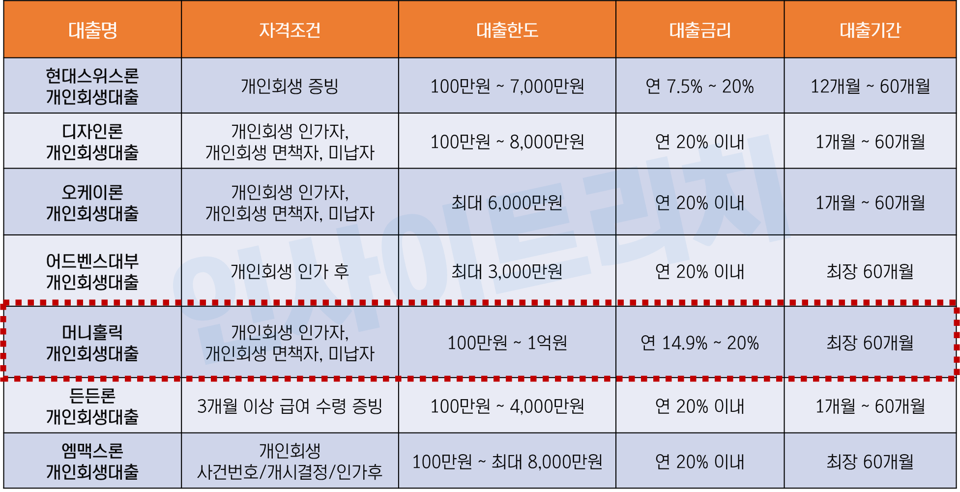 대출 상품: 머니홀릭은 다양한 개인회생 대출 상품을 제공하며, 개인회생 중대출, 완납자 대출, 채무통합 대출 등 상황에 맞춘 대출 옵션을 제공하고 있습니다. 이는 개인의 신용 등급 향상에도 도움이 된다고 합니다.
