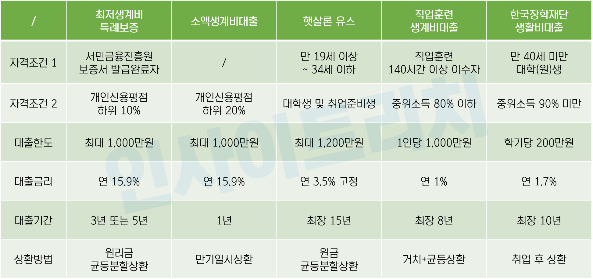 총 5가지의 상품이 대표적입니다. 각각 대출 목적이 뚜렷하여 이에 맞게 증빙할 수 있어야 승인이 가능합니다. 더불어 자격조건, 금리, 한도 차이가 크기 때문에 비교 체크할 것을 권장합니다.