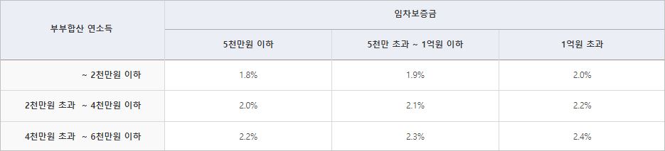 - 임차보증금 : 일반 또는 신혼가구 - 수도권 3억 & 그외 2억원 / 2자녀 이상 - 수도권 2.2억 & 수도권외 1.8억원