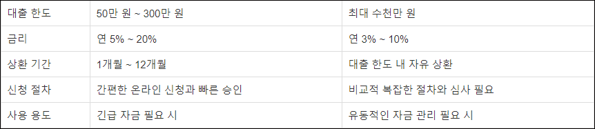 - 대출 한도: 일반적으로 50만 원에서 300만 원 사이