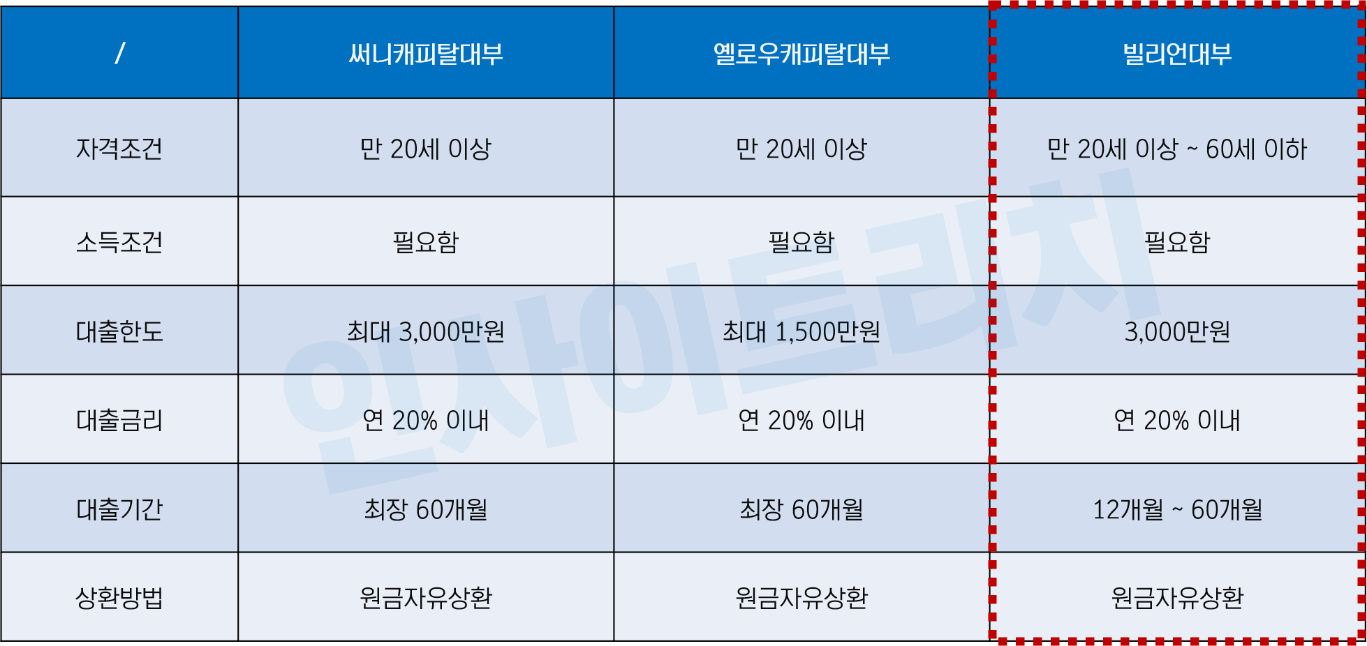 3금융권 대부업체 중에서 빌리언대부, 옐로우캐피탈대부, 써니캐피탈대부(일명 써니론) 등과 비교해보았을 때, 빌리언대부는 한도가 상대적으로 높은 편입니다. 높은 한도를 필요로 하는 직장인에게 유리하며, 자유 상환이 가능해 부담을 줄일 수 있습니다. 그러나 신청자의 신용 상황에 따라 조건이 다를 수 있으므로, 여러 대부업체의 조건을 비교하고 선택하는 것이 좋습니다.