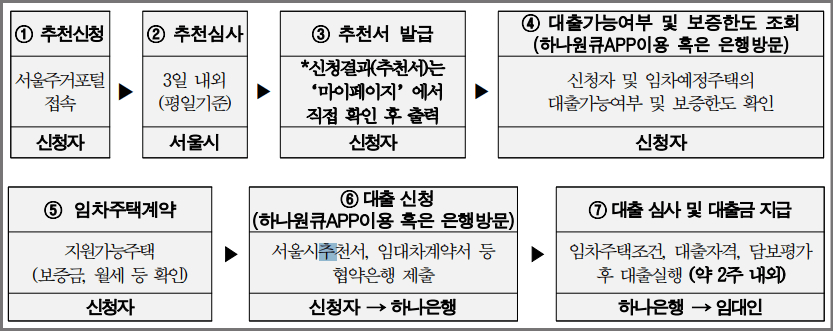 서울시 추천심사는 입주예정일 3개월 전부터 가능합니다. 승인이 난 후, 입주 1개월 전에 은행 대출심사를 진행하면 됩니다. 자세한 대출 절차는 다음과 같습니다.