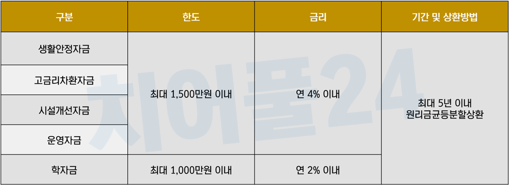 학자금을 제외한 모든 용도는 최대 1,500만 원까지 이용 가능하며, 금리는 연 4% 이내로 책정됩니다. 하지만 신청자의 소득 수준과 부채 상황에 따라 금리와 한도가 다르게 적용됩니다. 저소득층, 저신용자, 장애인, 고령자, 한부모 가정, 청년층 등 금융취약계층에 해당하는 경우 금리가 추가로 할인됩니다. 이 경우 학자금 대출은 연 1.4%, 다른 용도는 연 2.8%의 금리가 적용됩니다.