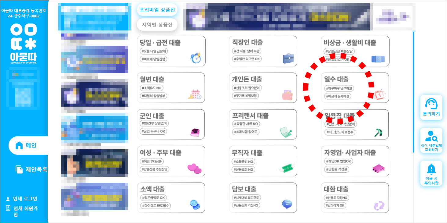 아묻따 홈페이지에서 우측에 있는 일수대출을 선택합니다. 혹여 일수 외, 급전, 비상금, 생활비 대출을 활용해도 됩니다.