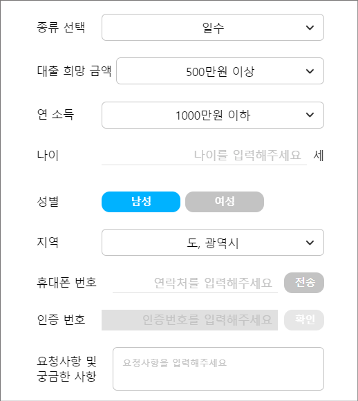 대출종류 및 희망금액, 연소득을 설정하면 됩니다. 무직자에 해당되는 경우 1000만원 이하를 선택하면 됩니다. 금액 및 대출종류는 상담 과정에서 얼마든지 변경할 수 있기 때문에 가볍게 골라도 됩니다.