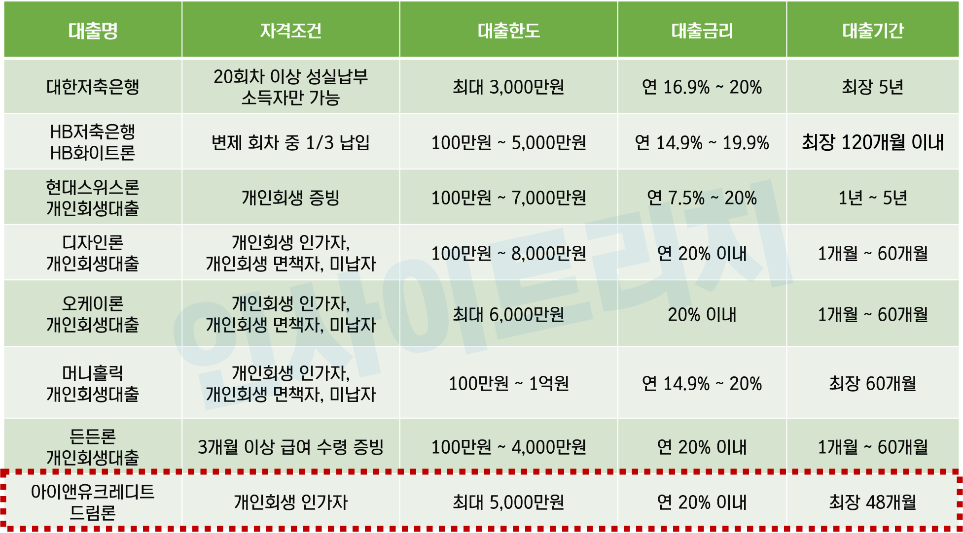 2금융권은 대한저축은행/HB저축은행, 3금융권은 현대스위스론/디자인론/오케이론/머니홀릭/든든론이 대표적인 개인회생대출입니다. 아이앤유크레디트 드림론은 개인회생 인가자만 승인됩니다. 타사 대부대출의 경우, 면책자, 미납자도 대출이 가능한 걸 고려했을 때 자격조건이 까다로운 편입니다.