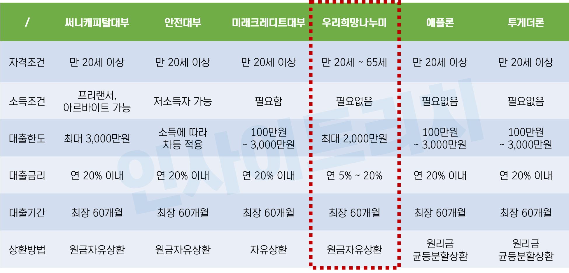 우리희망나누미 대출 중 가장 선호도가 높은 무직자대출을 비교해 보겠습니다.
