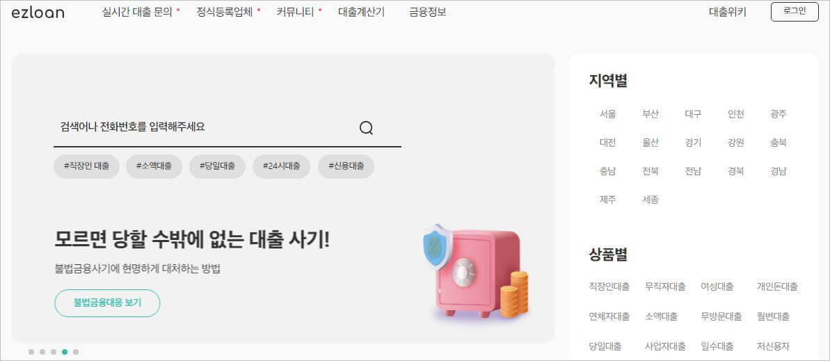 이지론은 지역별, 상품별 구분하여 찾을 수 있습니다. 무직자, 여성, 연체자 등 다양한 타깃으로 구분되어 있어 승인율을 높일 수 있습니다. 다만 좀 더 빠르고 정확하게 찾으려면 홈페이지 상단 '실시간 대출문의'를 활용하는 것이 좋습니다.