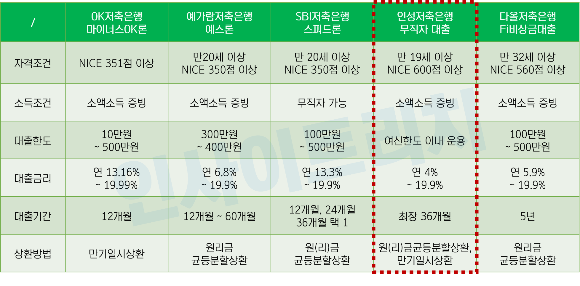 지금까지 만족도 높은 인성저축은행 무직자 대출 후기 및 조건 부결대안을 총정리해 말씀드렸습니다. 위 본문에서 추천드린 대출상품을 충분히 비교체크 후 선택하시기 바랍니다.