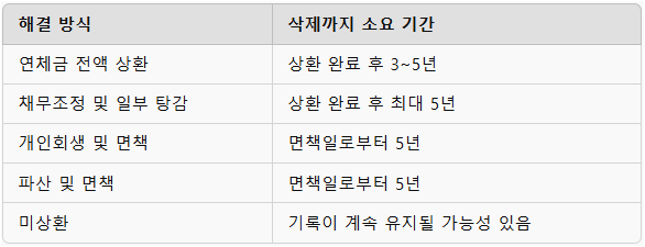 삭제 가능 여부는 연체금 상환 여부와 신용정보기관의 규정에 따라 달라집니다. 연체금을 갚지 않은 상태에서는 기록 삭제가 불가능하며, 상환 후에도 일정 기간이 지나야 삭제가 가능합니다. 또한, 자동으로 삭제되지 않는 경우도 있으니 신용정보기관에 삭제 요청을 해야 합니다.