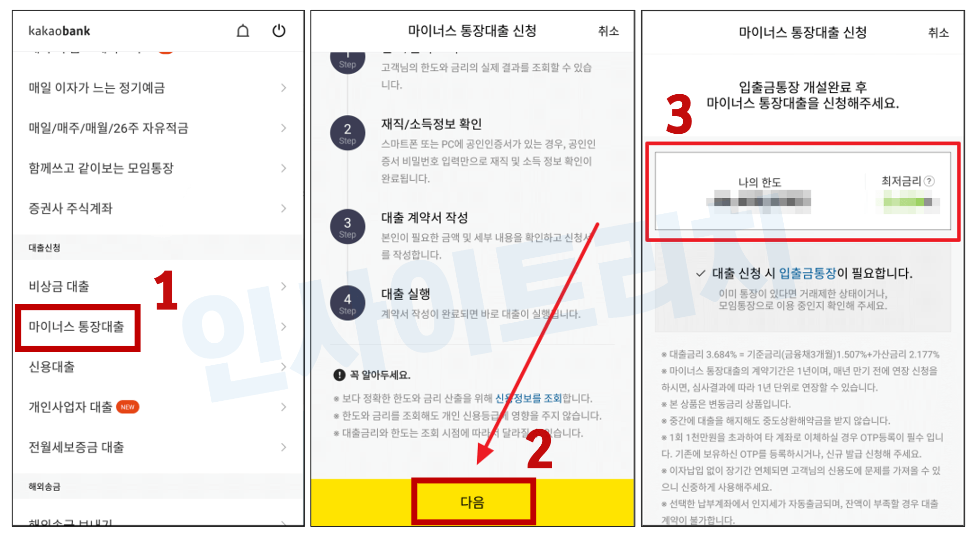 카카오뱅크 앱을 통해 간편하게 신청할 수 있습니다. 대출 탭에서 마이너스통장 대출을 선택한 후, 한도 조회를 하고 계약서를 작성하면 심사 후 바로 실행됩니다. 이 모든 절차가 5분 내에 완료될 수 있으며, 영업점 방문 없이 모바일로 진행됩니다.