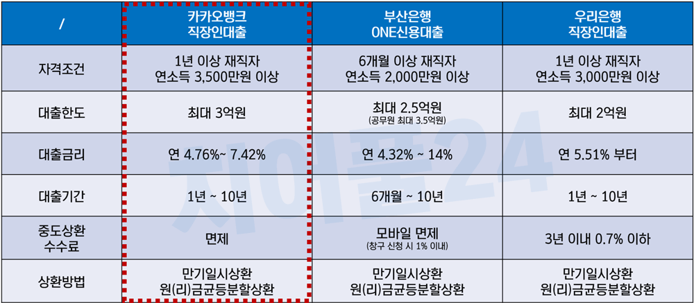 카카오뱅크 신용대출은 1금융권 대출 중에서도 금리 경쟁력이 뛰어납니다. 최저 연 4.76%의 금리가 적용될 수 있으며, 한도 역시 최대 1억 원 이상으로 넉넉한 편입니다. 우리은행이나 부산은행 등 주요 금융사와 비교했을 때 이율과 한도에서 유리한 점이 많아 목돈 마련이 필요한 직장인들에게 적합한 선택지입니다.