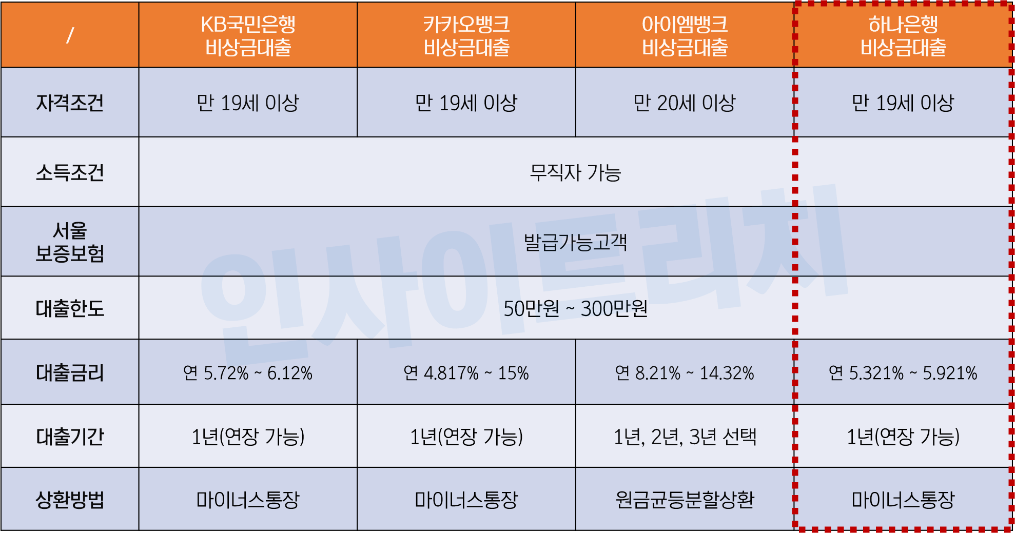 하나은행 비상금대출(하나원큐)**과 타사 상품을 비교해보면, KB국민은행, 카카오뱅크, **아이엠뱅크(대구은행)**와 비슷한 조건을 제공하는 것을 알 수 있습니다. 특히, 1금융권 비상금대출 상품들은 한도와 상환 방식, 대출 기간 등이 거의 동일합니다.