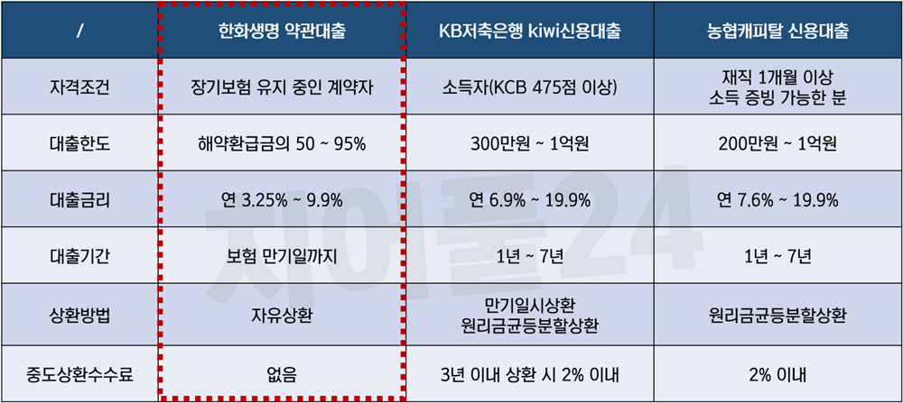 대출 한도는 가입한 보험의 해약환급금 50~95% 이내에서 결정됩니다. 금리는 연 3.25%에서 9.9%로 책정되며, 연체 시 발생하는 추가 이자는 원금에 포함되어 부과됩니다. 대출 만기일은 보험 계약 만기일까지이며, 자유롭게 상환 가능(매월 이자 납부 후 만기일에 원금 상환)합니다. 또한, 중도상환수수료와 취급수수료는 없습니다.
