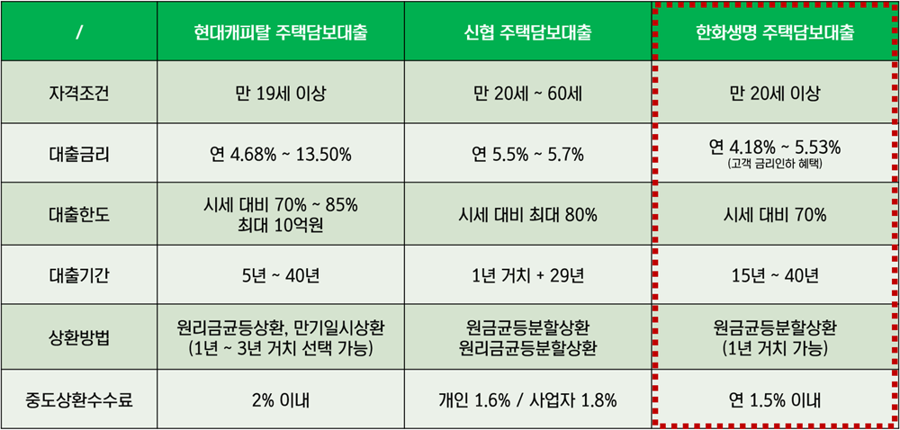 한화생명 홈드림 모기지론은 현대캐피탈, 신협 등과 같은 2금융권 주담대 상품과 비교했을 때 금리가 상대적으로 낮다는 장점이 있습니다. 최소 연 4.18%로 시작하며, 보험 고객의 경우 추가 금리 혜택도 받을 수 있습니다.