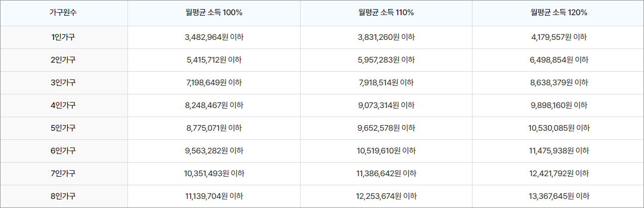 - 소득 기준: 세대 월평균 소득이 3인 가구 기준 100% 이내여야 하며, 1인 가구는 120%, 2인 가구는 110%, 맞벌이 부부는 120%까지 허용됩니다.