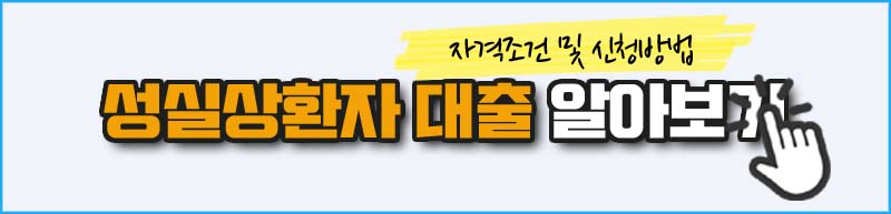 성실상환자 대출은 회생, 파산, 신용회복, 연체자, 신용불량자 등에게 판매되는 정부지원 상품입니다. 저금리로 장기간 대출이 가능하기 때문에 단연 1순위로 체크해야 합니다. 단, 조건 및 지원 용도가 다소 까다롭다는 단점이 있습니다.