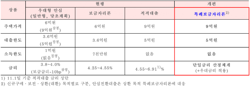 안심전환대출과 보금자리론은 3.6억원이 최대였으나 특례보금자리론은 한도가 5억원까지 확대되었습니다.