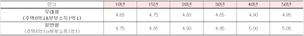 특례보금자리론 기본금리는 10년기준 우대형 4.65%, 일반형 4.75% 입니다. 차주의 특성에 따라 최대 90bp까지 금리우대가 가능하며, 100% 우대금리를 적용받는다면 3.75% ~ 4.05%의 저금리가 적용됩니다.