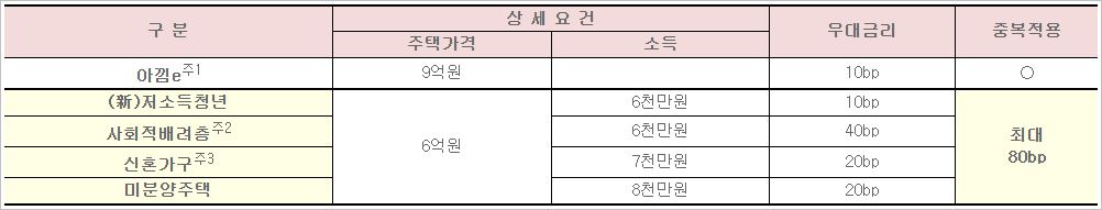 특례보금자리론 우대금리는 저소득청년, 사회적배려층, 신혼가구, 미분양주택에 따라 각각 10bp ~ 40bp가 주어집니다. 모든 항목이 중복적용 되기 때문에 우대항목에 해당되는지 꼼꼼히 체크해봐야 합니다.
