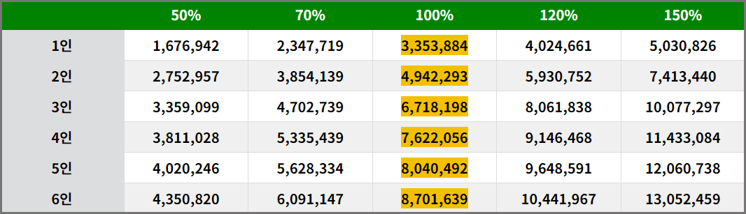 보통 월평균소득 100%를 기준으로 하여, 이를 노란색으로 체크해두었습니다.
