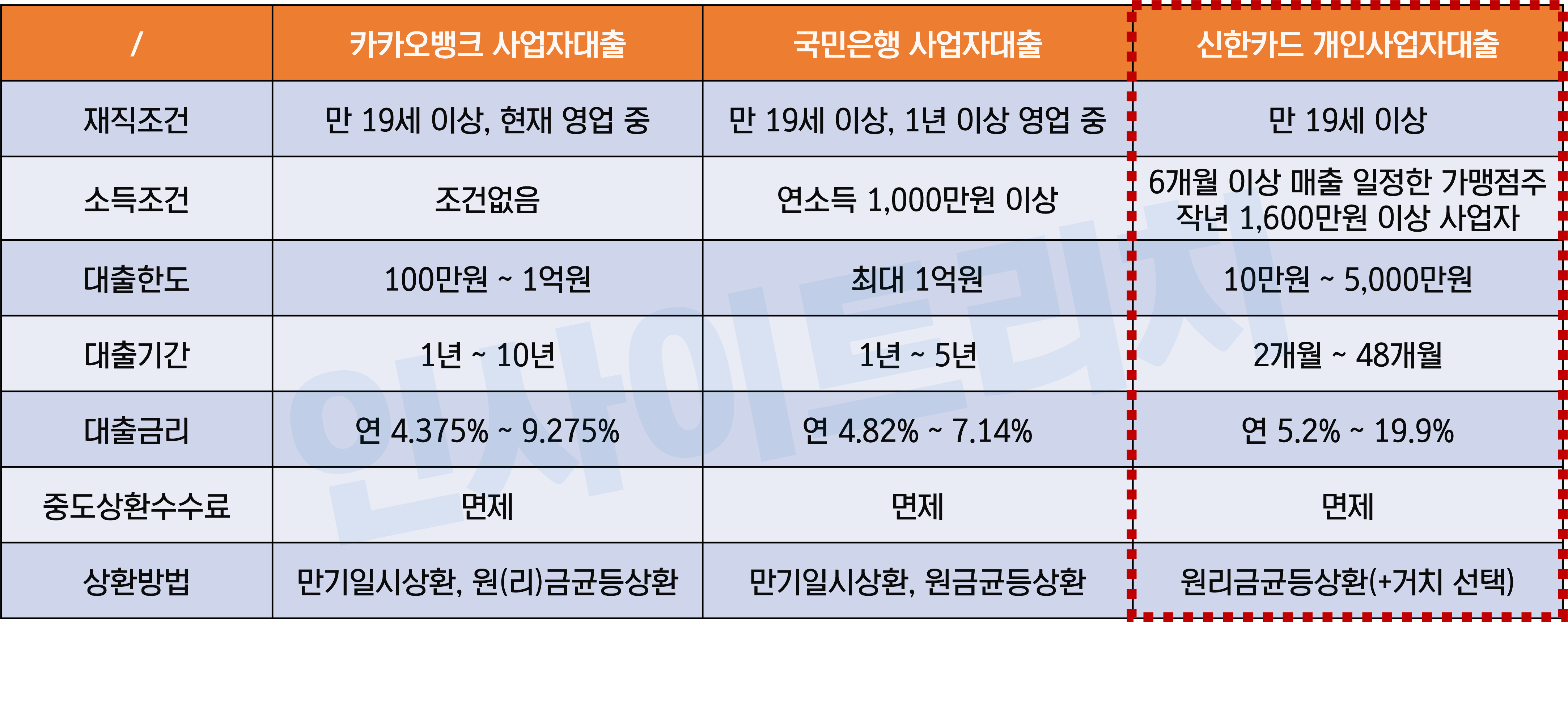 사업자대출 중 인기가 많은 카카오뱅크, 국민은행 상품과 비교해 보겠습니다. My Creadit 신한카드 개인사업자대출 조건이 좋은 이유는 3가지입니다.