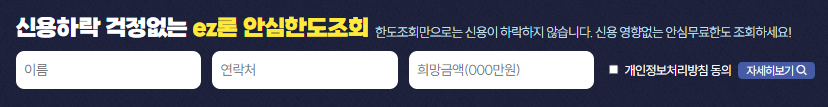 ez론대부중개는 PC 또는 모바일로 '안심한도조회(신용이력 영향 X)'를 하면 대출신청이 됩니다. 하단 검색창에 이름 및 연락처, 희망대출금액을 입력, 조회하시기 바랍니다. ▼