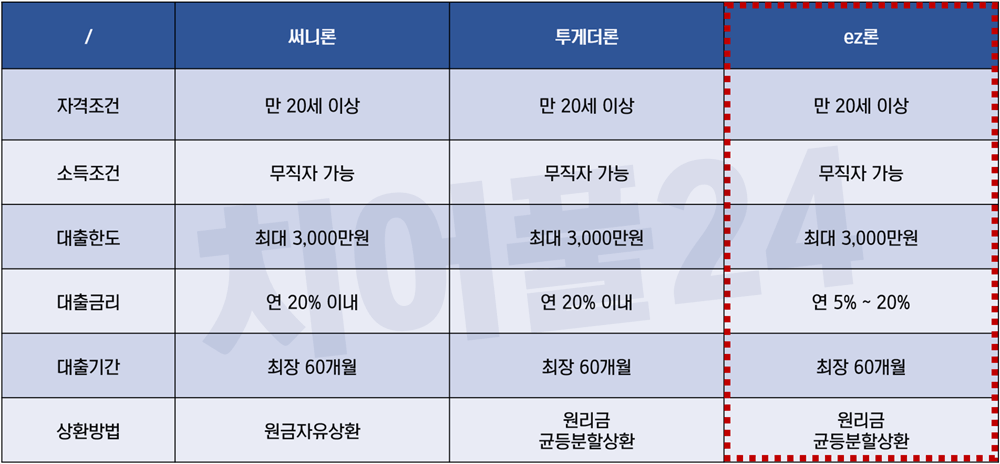 EZ론은 써니론, 투게더론 등과 함께 3금융권에서 자주 언급되는 상품입니다. 타사와 조건이 비슷해 보이지만, 최저 연 5% 금리 적용 가능성이 있다는 점이 차별화 포인트입니다. 또한, 절차가 간소화되어 신속한 대출이 가능하다는 장점도 있습니다.